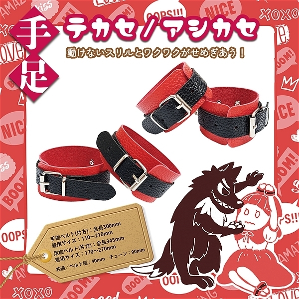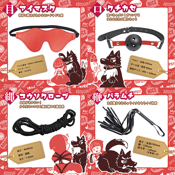 ■仕様:パッケージ:17.0×26.0×7.0cm 本体:@アイマスク(マスク部分8.5×20.5cm、フリーサイズ、素材:ゴムひも)、A口枷(ベルト全長61.0cm・ボール直径4.0cm・着用サイズ40.0〜54.0cm)B手枷(ベルト全長30.0cm・幅4.0cm・チェーン9.0cm・着用サイズ11.0〜21.0cm)C足枷(ベルト(全長34.5cm・ベルト幅4.0cm・チェーン9.0cm・着用サイズ17.0〜27.0cm)Dリード付き首輪(ベルト全長50.0cm・ベルト幅4.0cm・着用サイズ32.0〜40.0cm・リード100cm)E拘束ロープ(長さ4m65cm・太さ0.75cm・素材:組紐)Fバラ鞭(全長53.0cm・鞭32.0cm・持ち手12.0cm)