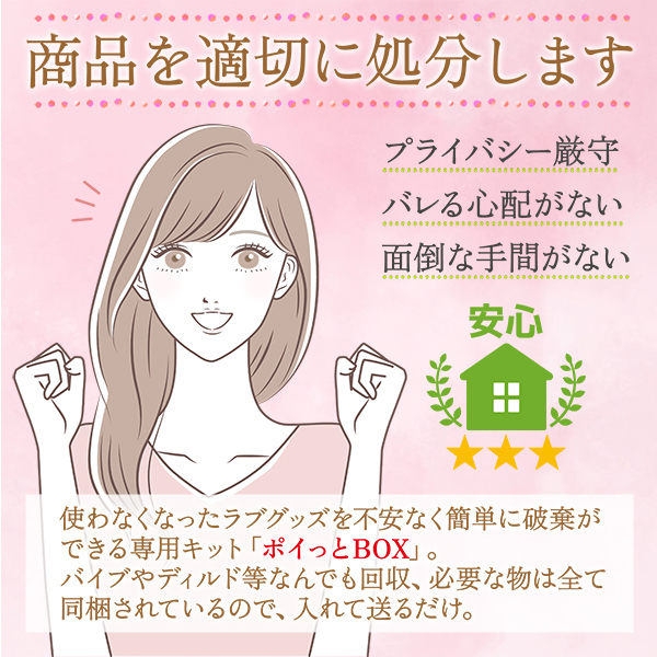 ラブグッズの処理に困った事はありませんか? その悩み、解決します!「アダルトグッズ、大人のおもちゃに興味はあるけど、捨て方がわからないし、一般のゴミと一緒に捨てた場合、万が一中身を見られたら…と考えると不安で買うのを諦めます」といった人もいるのでは?長年の販売実績と徹底したプライバシー管理。